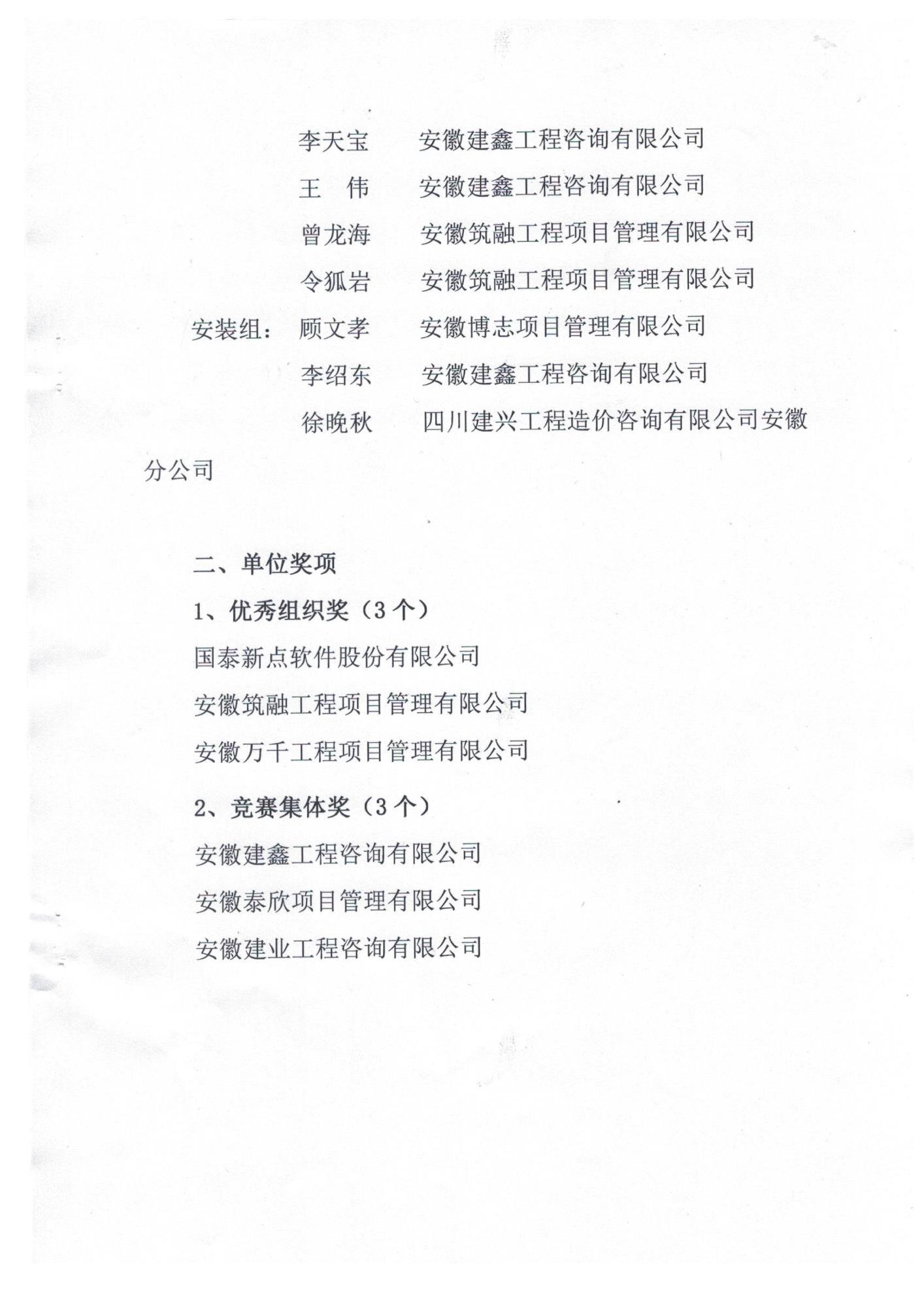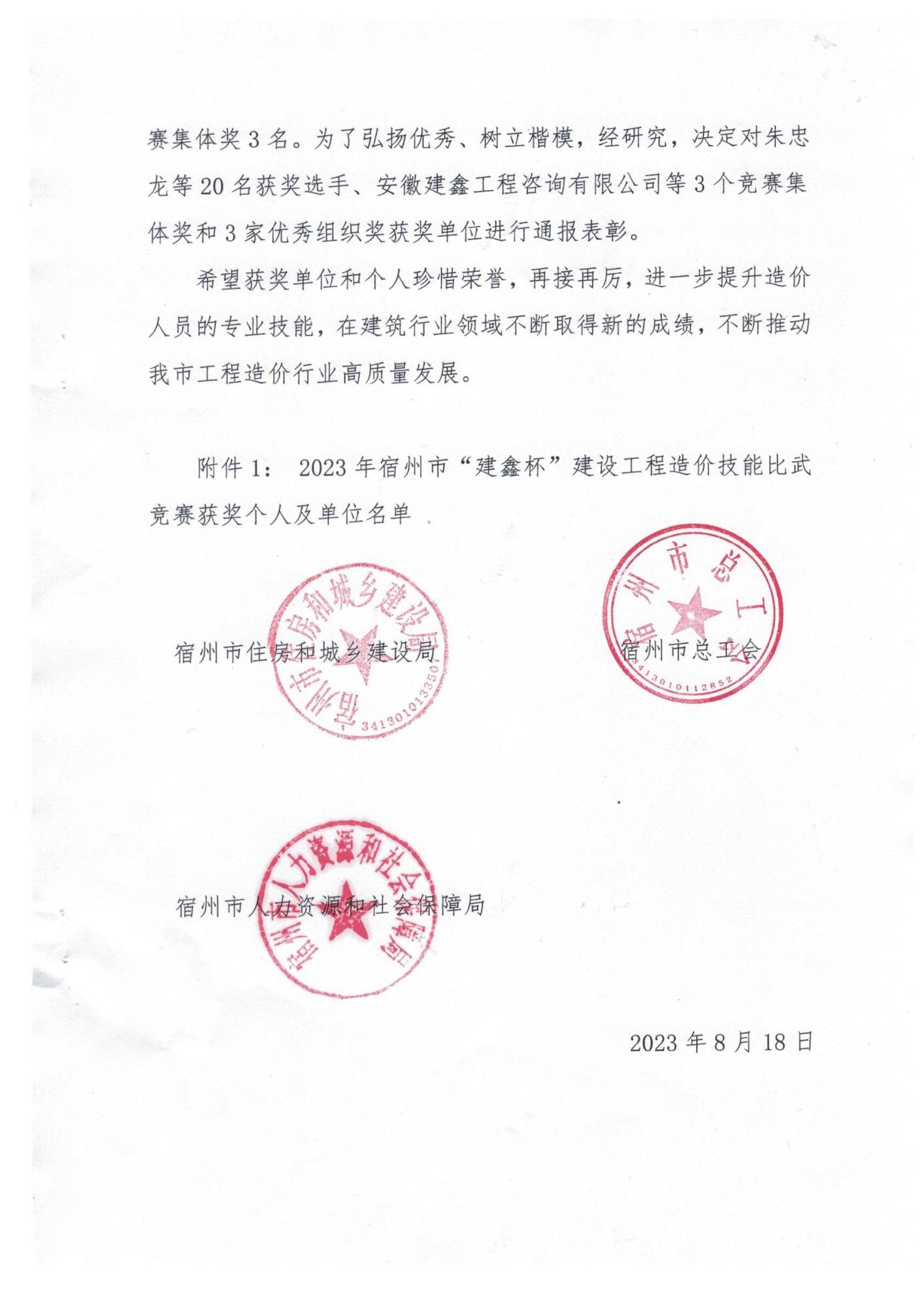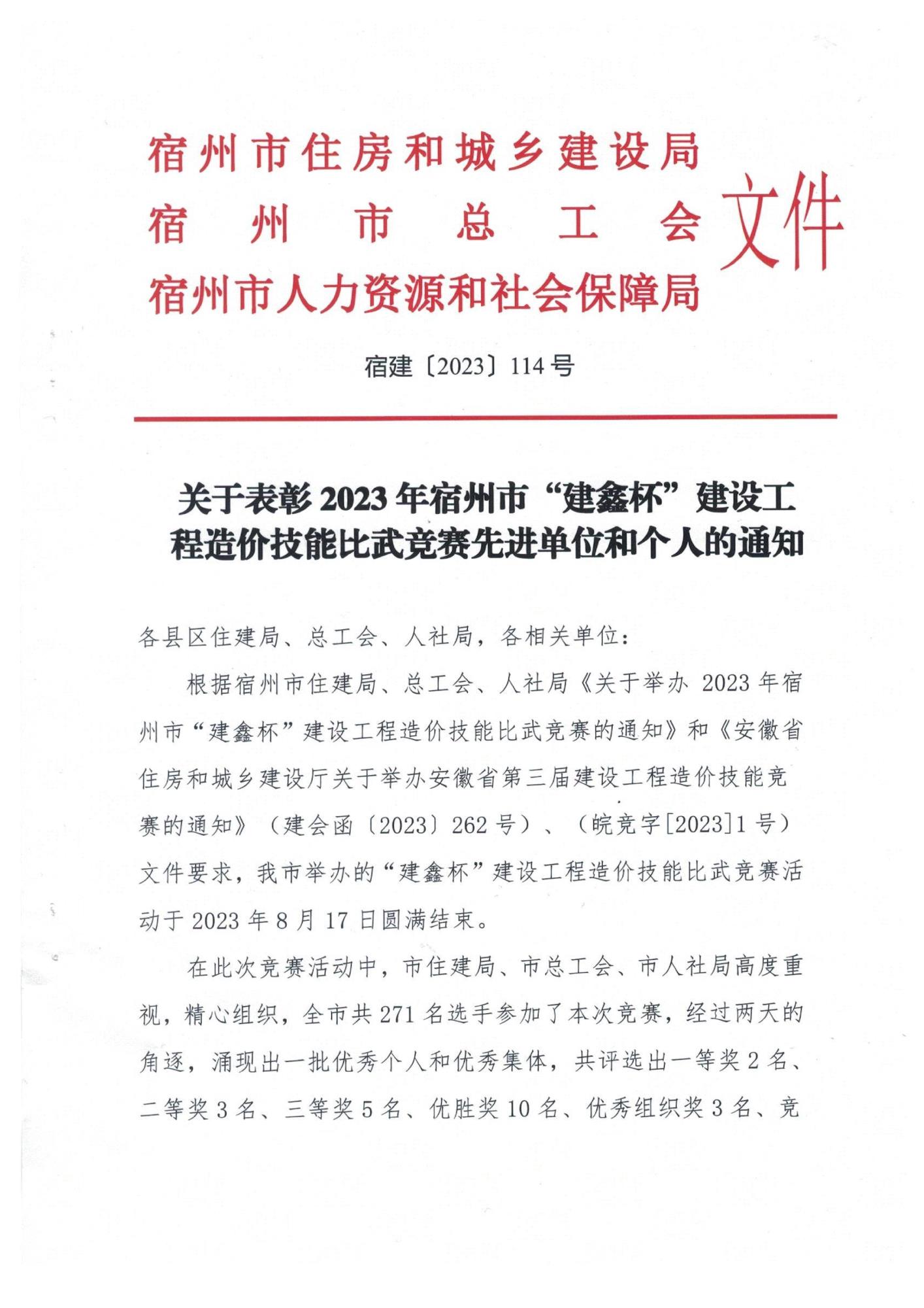 关于表彰2023年宿州市“建鑫杯”建设工程造价技能比武竞赛先进单位和个人的通知